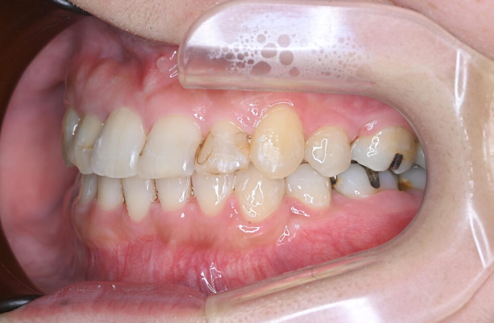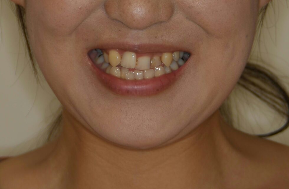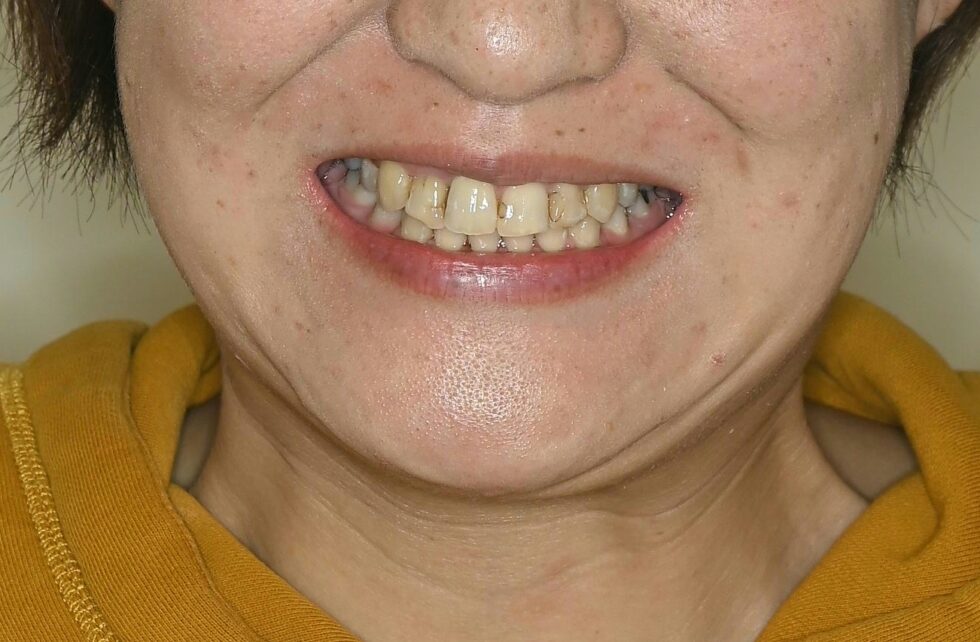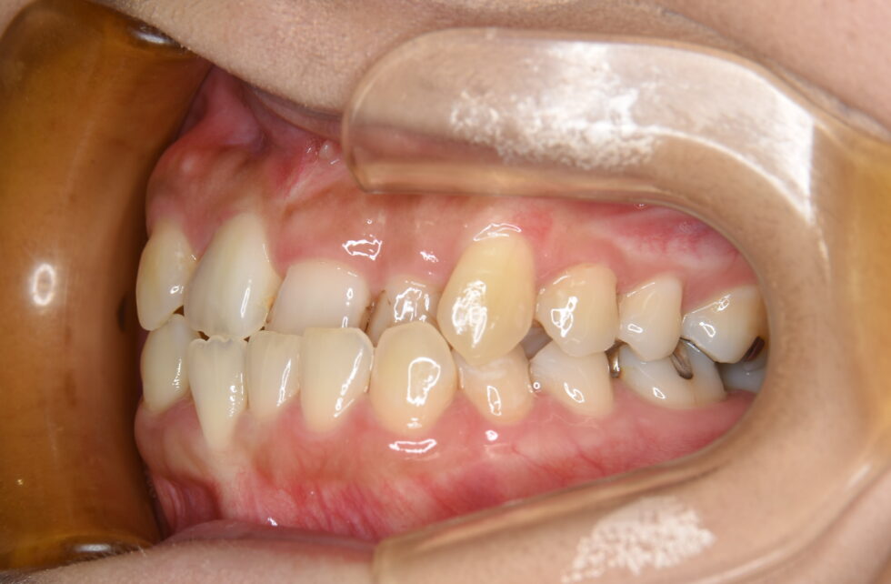 上顎は右側側切歯が口蓋側転位となり、その分上顎の正中線は右側へ4㎜程度偏位していた。また、右側第二小臼歯は残根状態で歯冠が無かった。さらに、左側中切歯、側切歯は反対咬合となっていた。上顎右側に矯正用アンカープレートを植立し、上顎は左右側第二小臼歯、下顎は左右側第一小臼歯を抜歯していただきマルチブラケット装置を使用して動的治療を行った。上顎右側側切歯が完全に口蓋側転位になっているにもかかわらず、残根となっていた第二小臼歯を抜歯する必要があったため、上顎右側第一小臼歯と犬歯の遠心への移動に時間がかかり動的治療期間は3年5ヵ月間を要した。(調整来院30回)しかし、可能な限り健全な歯を残すことができた。また、虫歯のリスクが高い方であったが歯列が整ったことでセルフケアがしやすくなった。