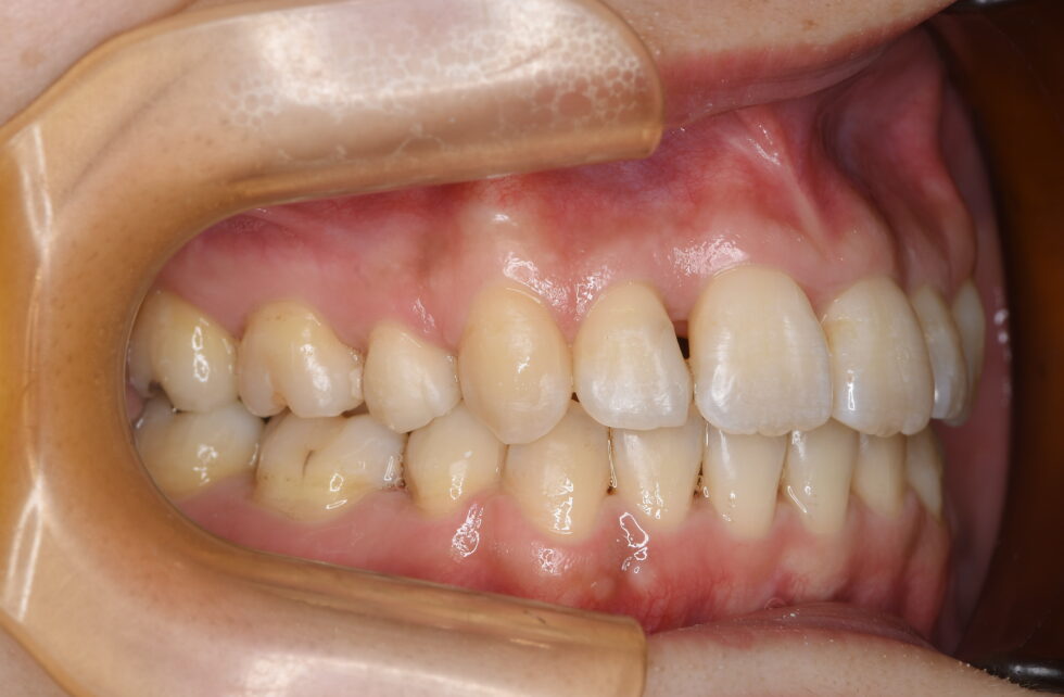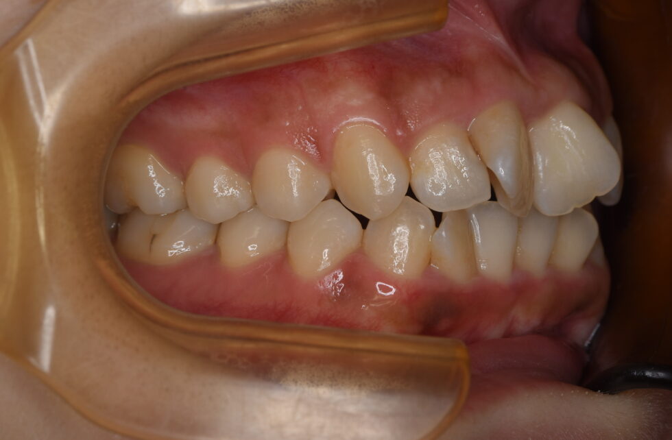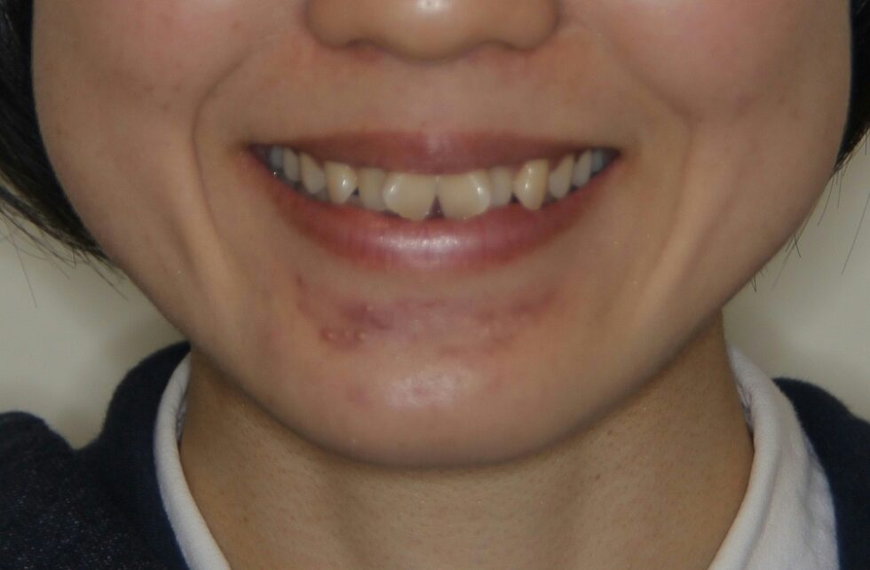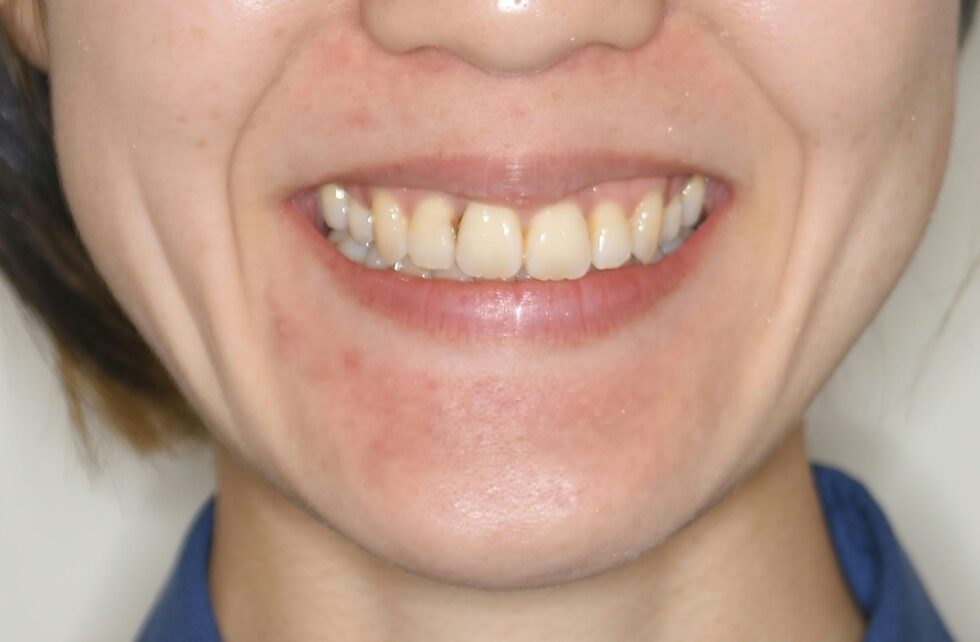上顎左右側中切歯がそれぞれ45度程度ねじれ、下顎前歯4本もそれぞれがねじれて生えていた。アングルⅠ級叢生と診断し、さらなる口元の突出を招かないよう、可能であれば口唇の2~3㎜の後退が生ずるように考慮して、上下顎左右側第一小臼歯を抜歯していただきマルチブラケット装置を使用して動的治療を行った。捻転が改善し咬合状態も良好な状態にすることができた。動的治療期間2年1カ月間(調整来院19回)