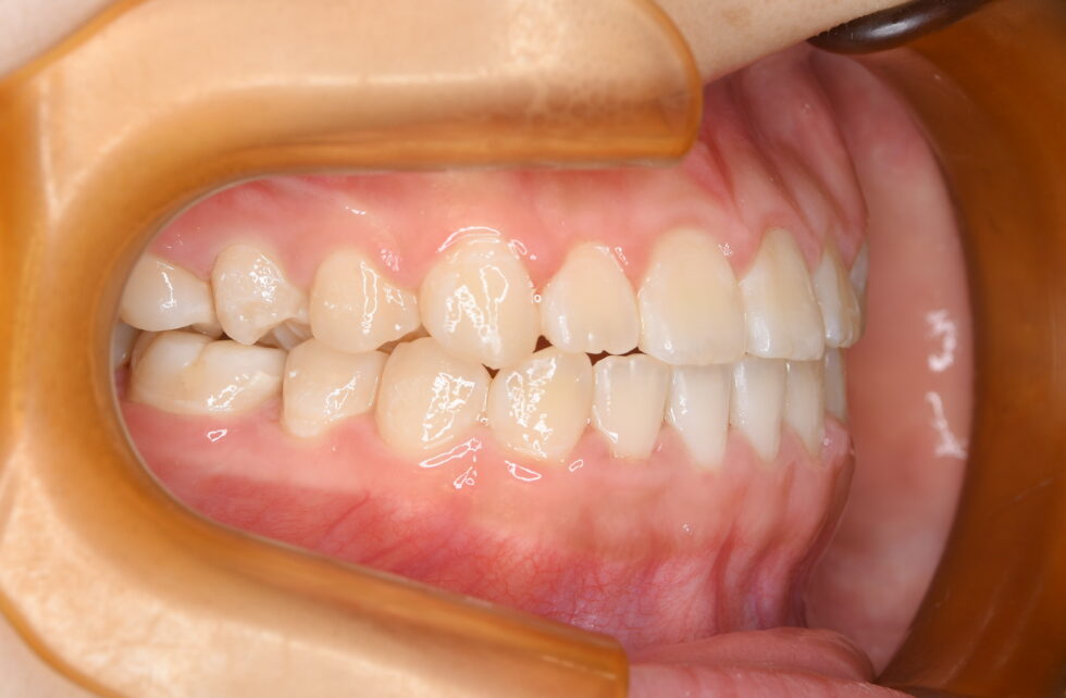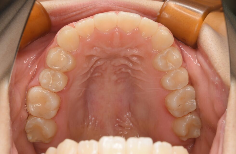 埋伏している小臼歯は歯冠を遠心に向けて埋伏しており口蓋側面が歯肉から少し露出していた。また、歯列内に移動するための余地も5㎜程度不足しており、この余地を作ることと、埋伏歯の牽引を同時に行うことを目標に治療を開始した。近心を向いていた歯根の移動に時間を要し、頬舌側を逆転する形で歯列内に配列した。従って、頬側側にある口蓋側咬頭の咬合状態は甘いが、口蓋側にある頬側咬頭は咬合接触を得ることができた。動的治療3年3か月間で保定へ移行した。