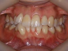 下顎左側側切歯が先天欠損で、上顎右側第一小臼歯も抜歯されていた。上顎右側小臼歯を抜歯していただき動的治療を行った。下顎が3本切歯であり上下の正中線の合致は困難であるが、下顎歯の抜歯を行わない方針であること、さらに下顎前歯の叢生の改善により歯間弧形空隙(いわゆるブラックトライアングル)が生ずる可能性を説明したが、この方針やリスクに同意が得られたため、上顎左側小臼歯のみを抜歯して動的治療を行った。的治療期間1年10カ月