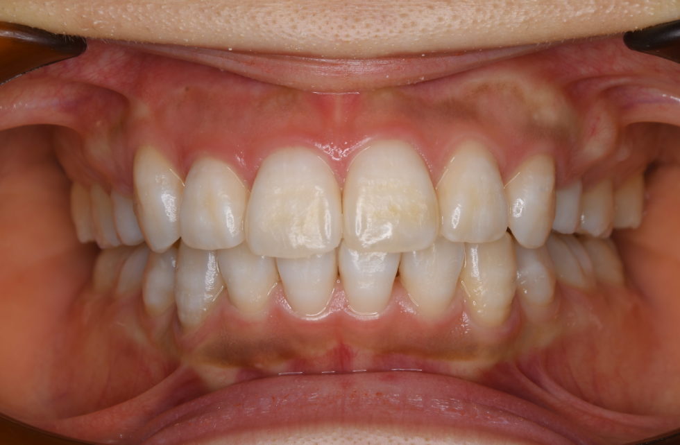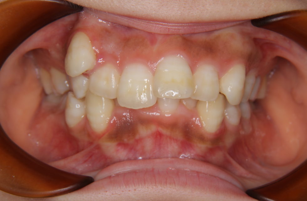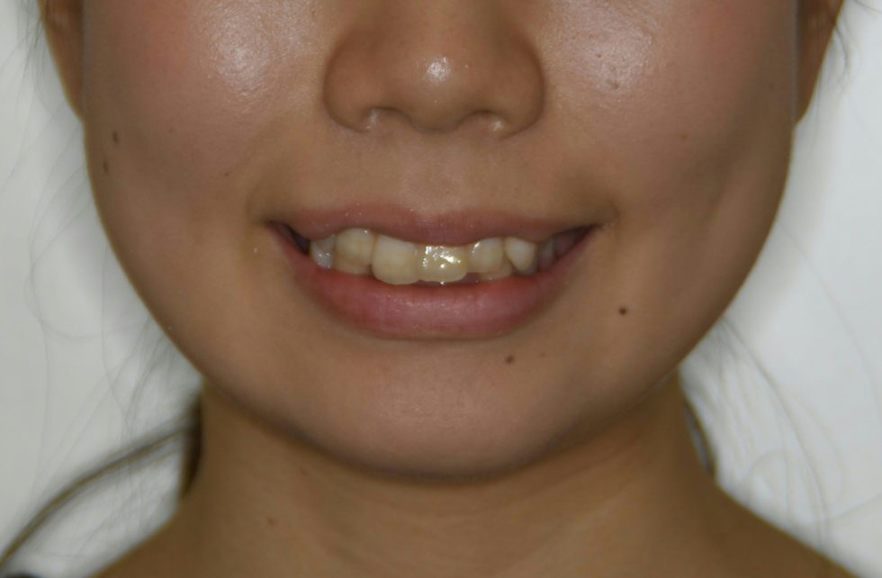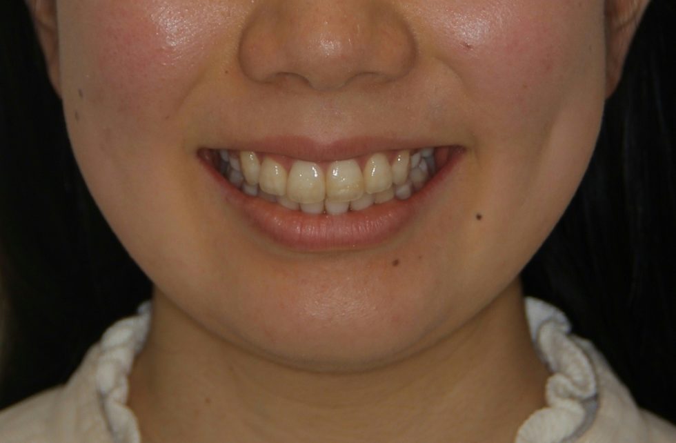 上顎右側犬歯は完全に歯列から外れて生え、また、左側中切歯は約7㎜突出していた。下顎前歯にも著しい叢生があった。セファロ分析の結果、著しい叢生を伴う骨格性上顎前突と診断し上下顎小臼歯を抜歯していただき、矯正用アンカースクリューを併用し、マルチブラケット装置を使用して動的治療を行った。矯正用ゴムなどの使用状況も良く良好な結果が得られた。歯の痛みはあったが2、3日で普通の食事ができるため過度な心配は必要がない。また、歯が動いていることが目に見えて分かるためモチベーションが保てたとおっしゃっていた。