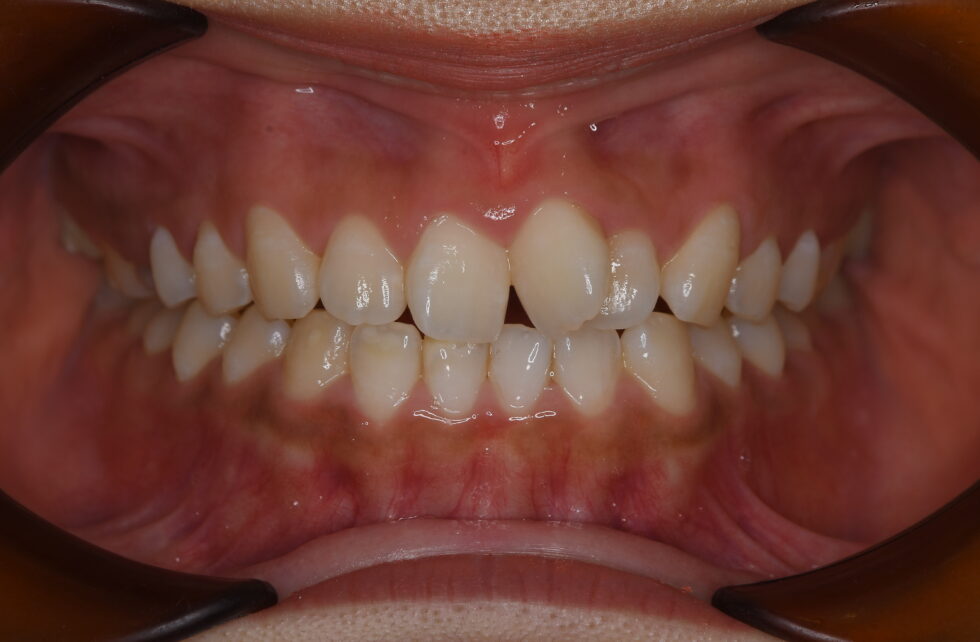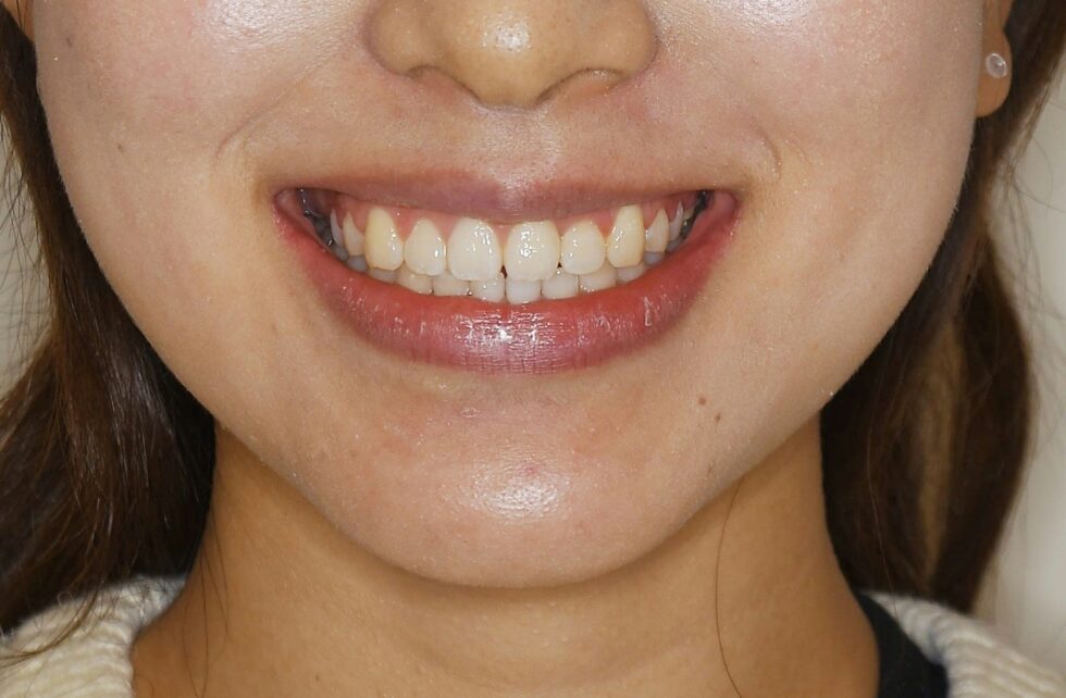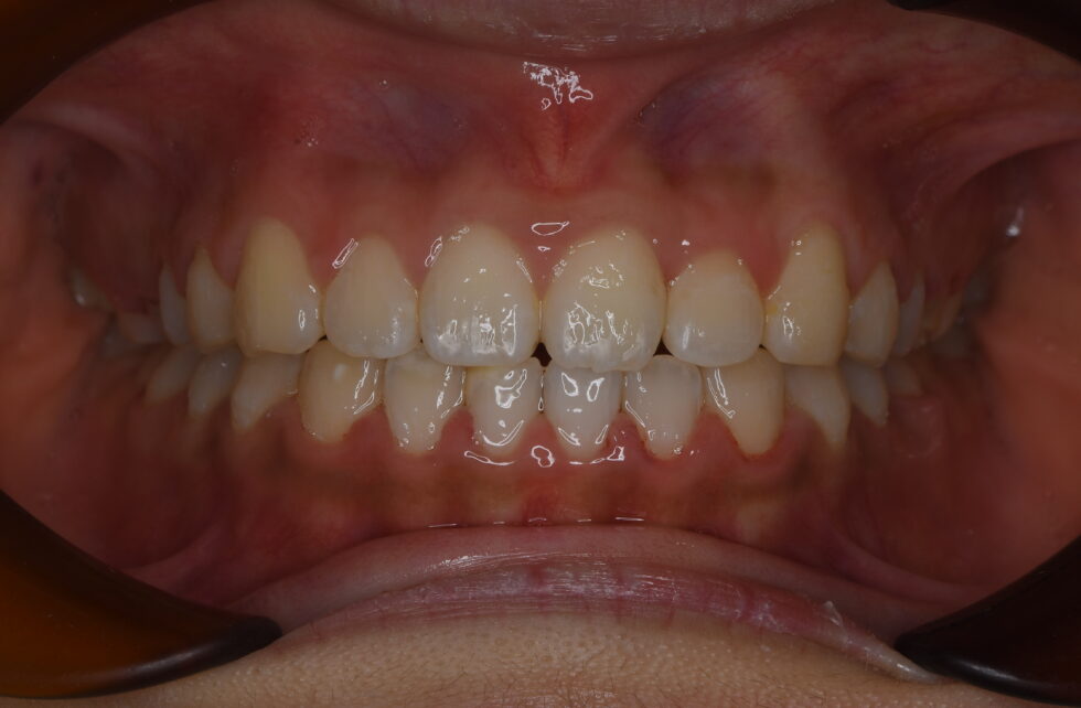 前歯の乱れを気にしておられました。マルチブラケット装置を使用して、非抜歯による矯正治療を行いました。歯を抜いたり削ることなく前歯の乱れを改善し、正中を一致させることが出来ました。
