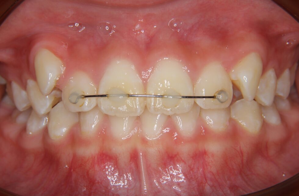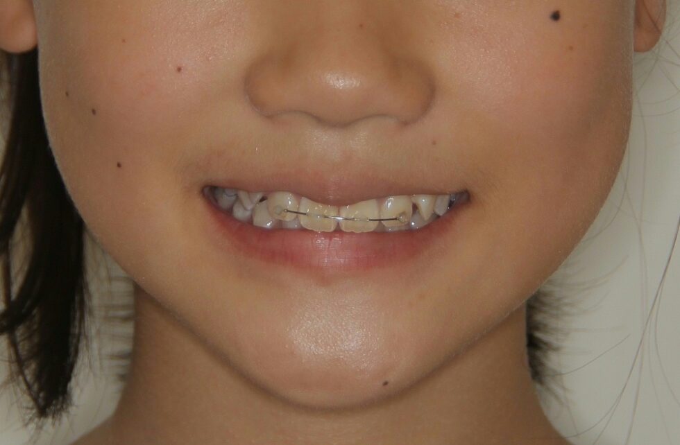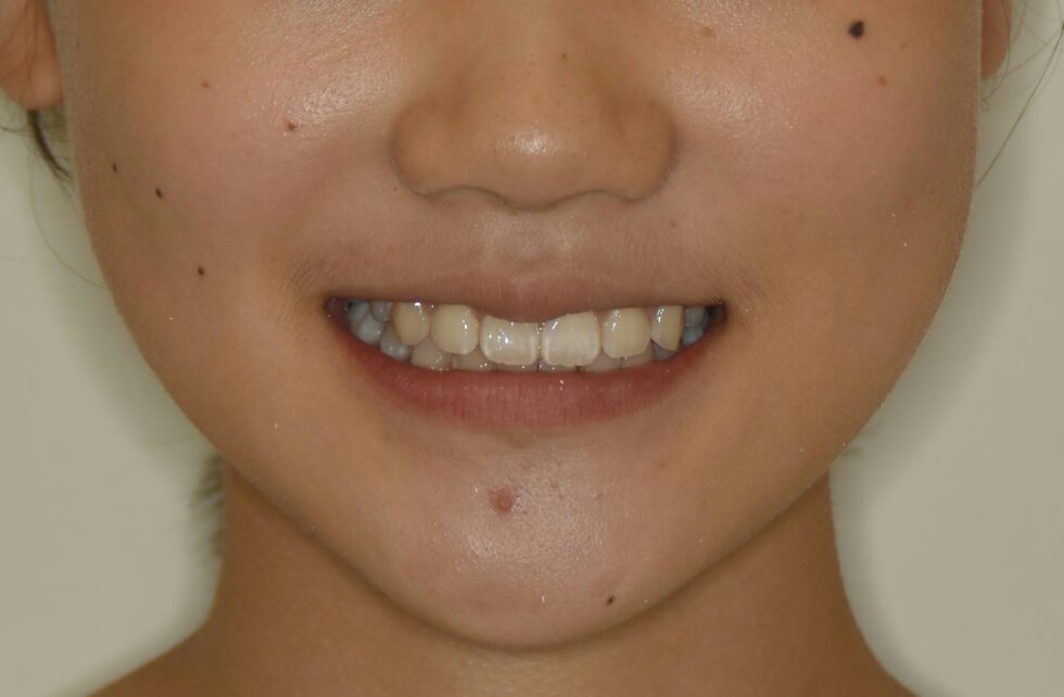 下顎の前歯が生まれつき1本少ないことも考慮したうえで、永久歯列への生え変わりが進んだ12歳から上顎左右側第一小臼歯と下顎左側第二小臼歯の抜歯を行って頂き、マルチブラケット装置を使用して動的治療を行いました。