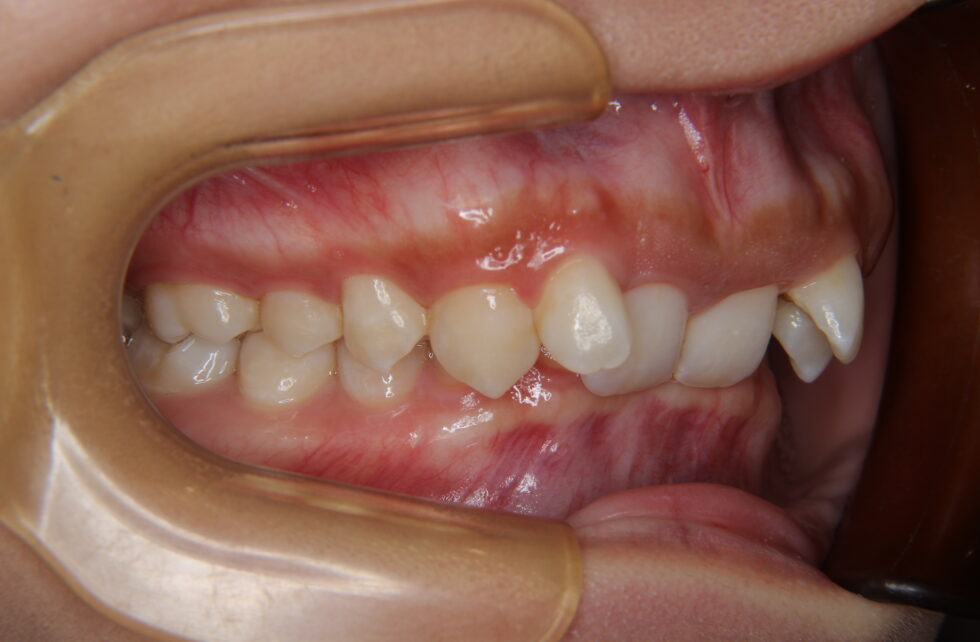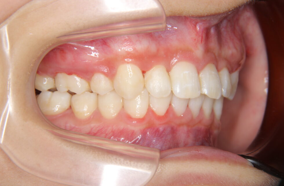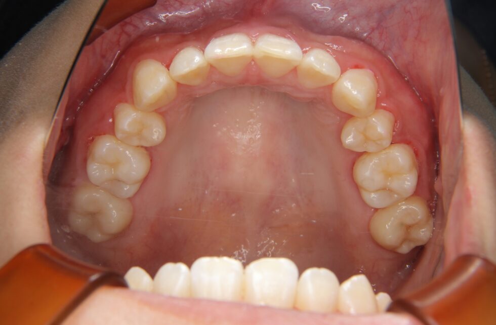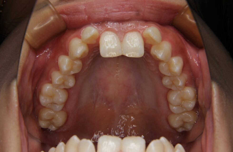 初診時年齢24歳の女性 上顎前歯の内傾を主訴にご来院いただいた。長年、前歯が内側を向いていることを気にされていたが治療を行う勇気が出なかったとのことであった。しかし、咬合時に上顎前歯に痛みを感じるようになったことから治療を希望された。セファログラム他の分析から咬合力の極めて強いと考えられる骨格をされていることが分かった。上あごの前歯が内側を向いた骨格性上顎前突で、アングルの分類Ⅱ級2類と診断した。咬合力が強いと歯の動きは緩徐で、前歯のかみ合わせが深くなり、上あごの前歯の後退が困難になる場合がある。このため、上顎左右側小臼歯を抜歯していただき、矯正用アンカープレートを併用して、上下顎マルチブラケット装置を使用して動的治療を行った。内側を向いていた上顎前歯は適正な角度とすることができた。