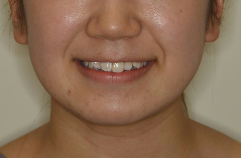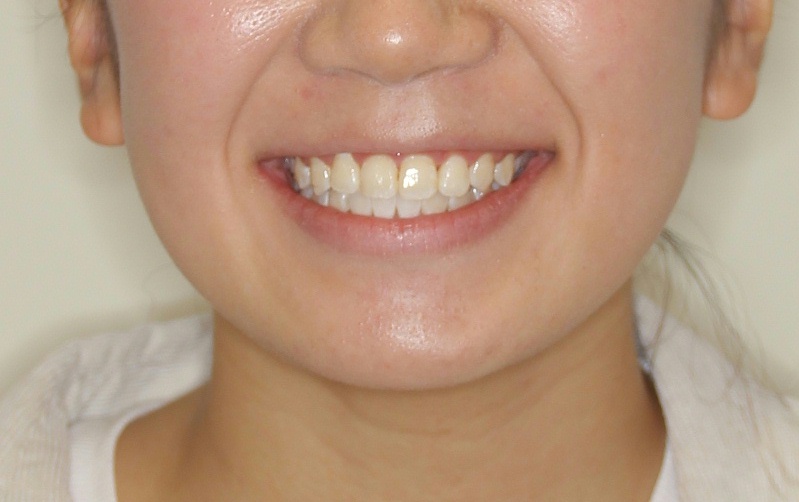 上顎左右側側切歯が口蓋側転位で捻転していた。右側第二小臼歯は口蓋側へ、左右側第二大臼歯は頬側へ転位して遠心へ傾斜していた。第二大臼歯の後方傾斜は歯が並ぶ歯槽骨の奥行きが小さいことを示し、歯の後方への移動は困難であると考えられた。下顎前歯の叢生量は5㎜程度であったが、CTで確認した歯が並ぶ奥行きや歯槽骨の幅は上顎同様で各歯を後方へ移動するには不十分であると評価した。口元の状態も上下の口唇がほぼEライン上にあり、歯列の前方への拡大処置は望ましくない。また、患者さんはマウスピース型矯正装置での治療を希望された。これらをふまえ、上顎は左右側小臼歯を抜歯し、下顎は各歯隣接面を削除するIPRを行って叢生の改善をおこなった。動的治療期間2年7か月間 アライナー86枚
