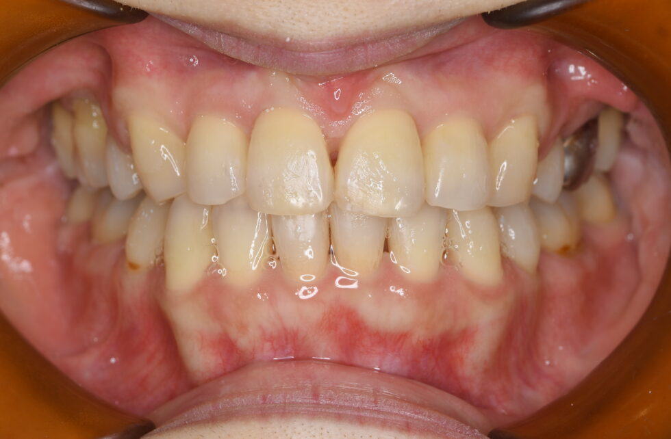 上顎左右側中切歯が前方へ傾斜するように突出し、側切歯は捻転して口蓋側へ転位していた。鼻唇角は90度を少し下回り、閉唇時にはオトガイ部の著しい緊張が見られた。セファロ分析の結果、下顎の後退を少々認めるが、上下顎前突として上下顎小臼歯抜歯を行っていただき、マルチブラケット装置を使用し矯正用アンカースクリューを併用して叢生の改善、前歯の後退を行った。前歯の後退が十分行われ、口元の突出や閉唇時のオトガイ部の緊張は改善した。動的治療期間2年9カ月 治療費の目安90万円程度