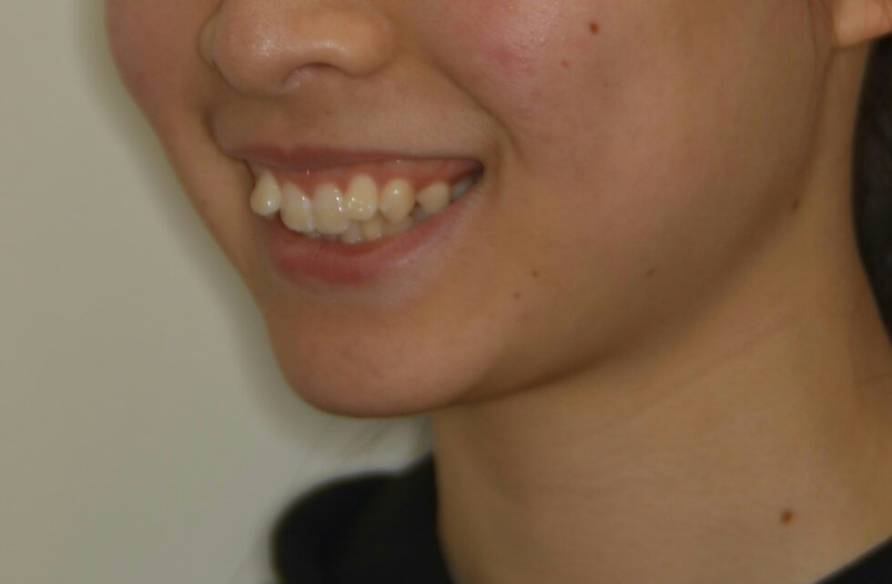 上顎左右側側切歯が唇側転位となり下顎前歯も前後にずれてデコボコに生えていた。また、臼歯部は下あごの奥歯より上あごの奥歯が前方にかみ合っていた。