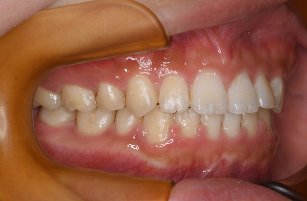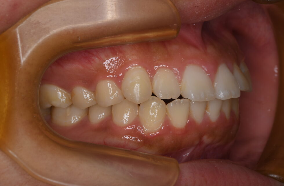 口元の突出および前歯の前傾を気にしておられました。審美的な矯正装置を希望されたため上顎舌側(裏側)・下顎唇側マルチブラケット装置を使用して、上下顎左右側小臼歯の抜歯による動的治療を行いました。前歯の前傾を改善し、口元の形態を整えることが出来ました。