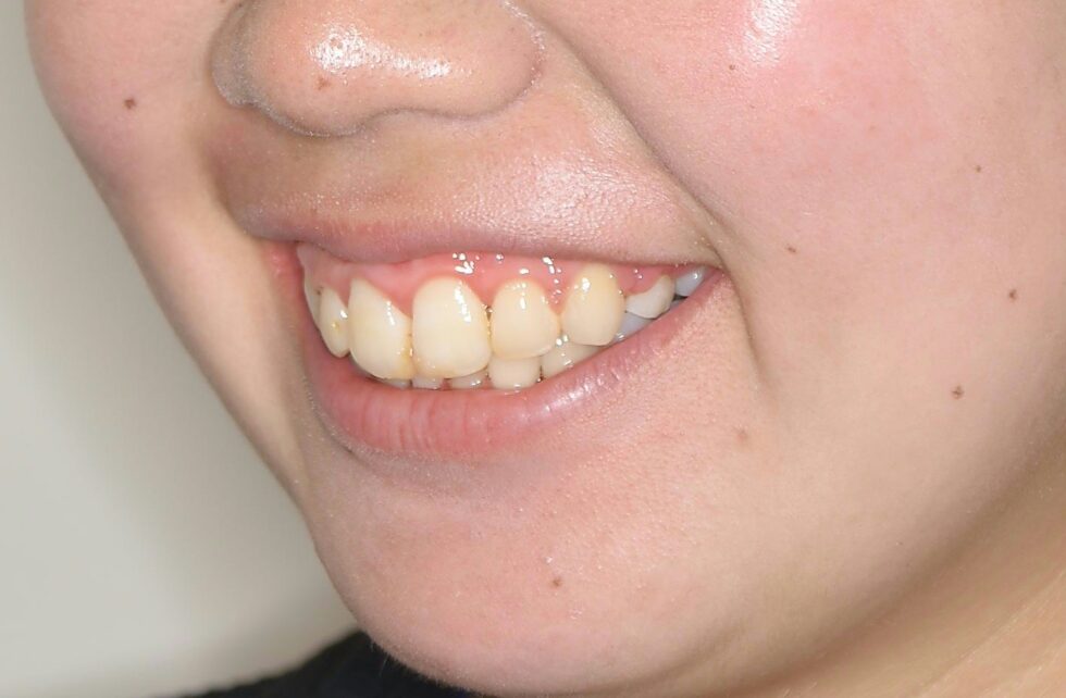 前歯の突出と乱れを気にしておられました。マルチブラケット装置を使用して、上下顎左右側小臼歯の抜歯による動的治療を行いました。突出していた前歯を後退し、乱れも改善することが出来ました。動的治療期間は2年10ヶ月間
