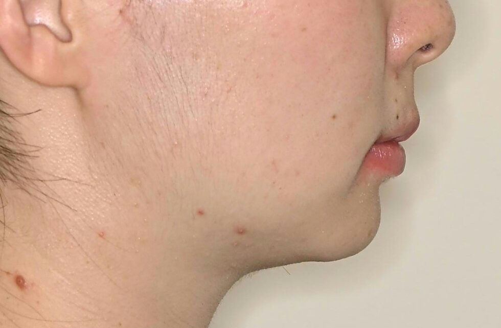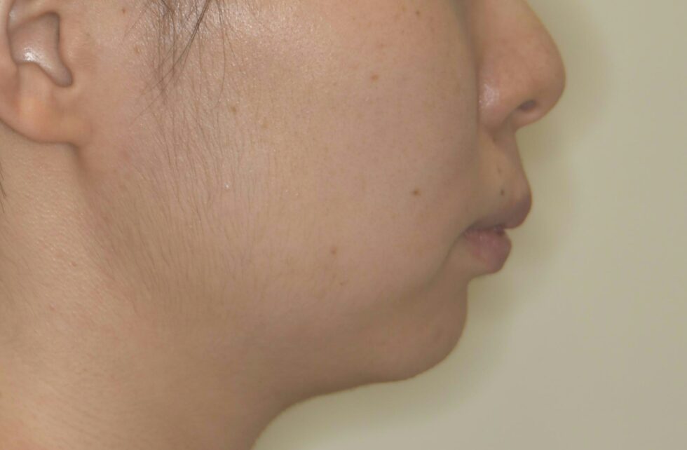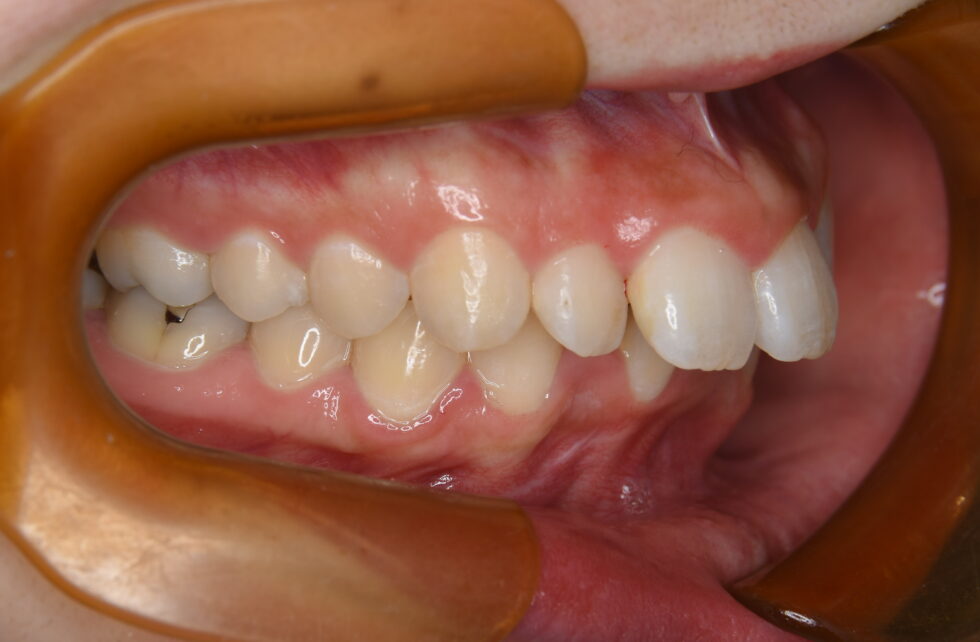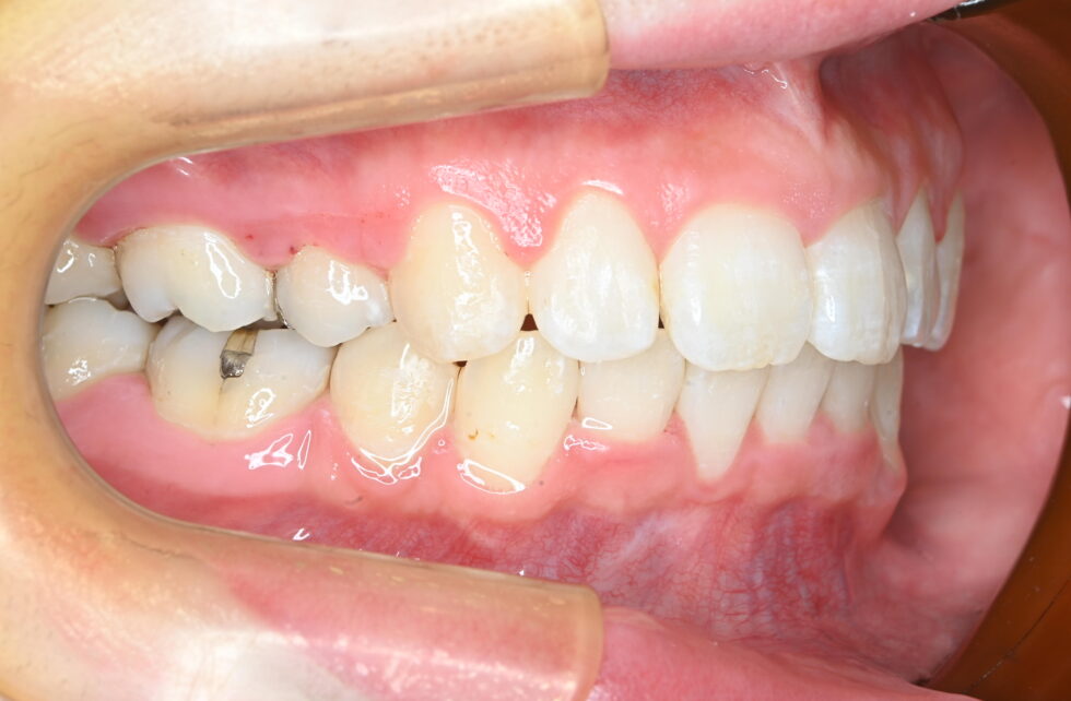 初診時年齢29歳の女性 上顎前歯の前突と下顎前歯部叢生を主訴にご来院いただいた。オーバージェットは9㎜で特に左右中切歯が前方へ傾斜するように突出してた。下顎前歯は叢生となり左側第二小臼歯も舌側へ倒れていた。セファログラム他の分析をもとに下顎前歯部叢生を伴う骨格性上顎前突と診断した。上顎第一小臼歯、下顎第二小臼歯を抜歯していただきマルチブラケット装置を使用して動的治療を行った。矯正用ゴムの使用など協力状態も良く良好な結果を得ることができた。