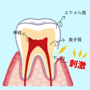 歯は、エナメル質という身体の中で一番硬い成分で守られていますが、このエナメル質が様々な原因によって削られたり、すり減ったりすることで歯の神経のある象牙質がむき出しになります。この象牙質がむき出しになることで神経に痛みが伝わり、しみると感じるのが知覚過敏です。