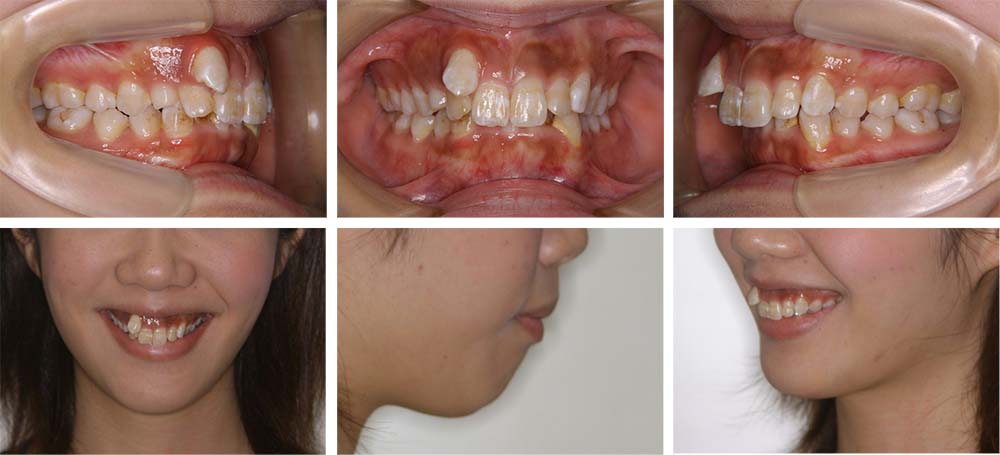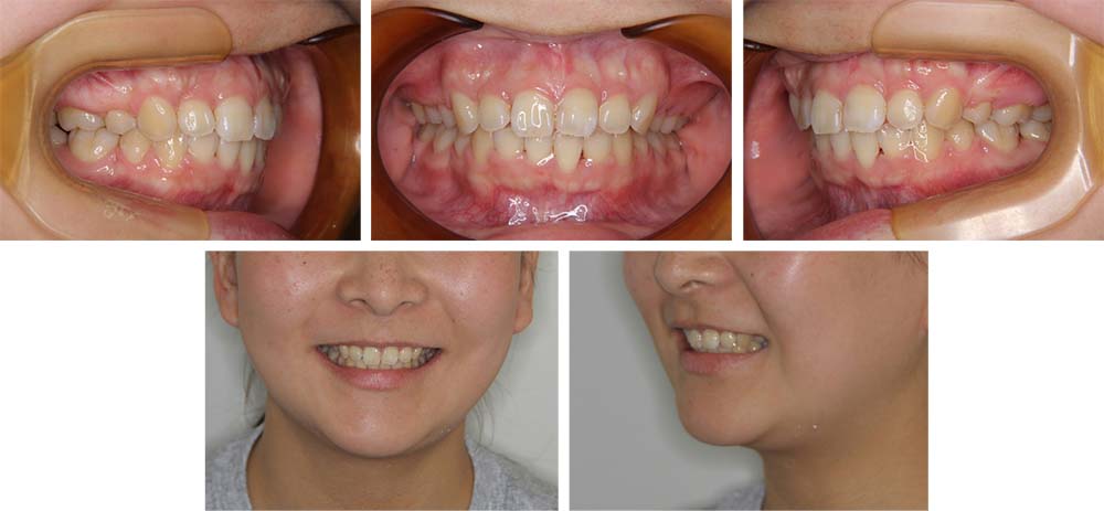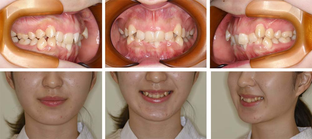 上下顎前歯部叢生を主訴としてご来院いただいた。顔貌はオトガイ部が後退した形態で、閉唇時にはオトガイ部が緊張していた。口腔内は上顎右側中切歯が捻転して、下顎前歯が各歯が前後にずれていた。側貌セファログラムの分析の結果、叢生を伴う骨格性上顎前突と診断した。患者さんの希望で上下顎舌側マルチブラケット装置を使用することとなり、上下顎小臼歯を抜歯していただいて、口蓋に矯正用アンカースクリューを併用して治療を行った。前歯の整直、後退を行った。オトガイ部の緊張がなくなり、口元の安寧が得られた。上顎前歯の圧下を同時に行ったことから、ガミースマイルの軽減もできた。動的治療期間2年5か月間。