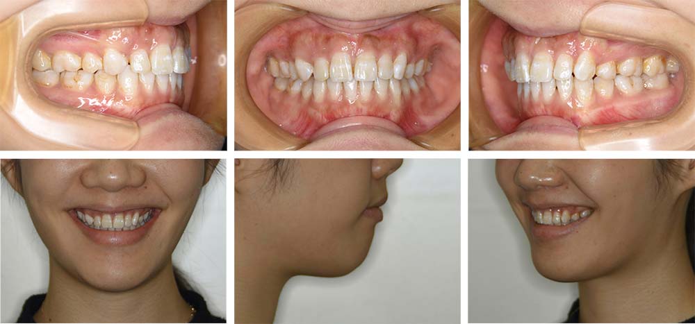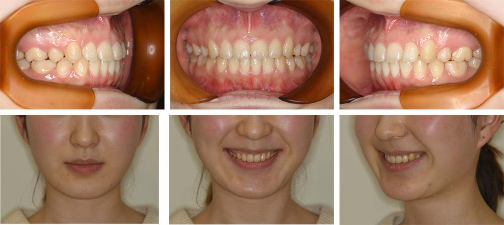 前歯が少し重なっている前歯部叢生を主訴として来院された。初診時ご相談時には口元に対しての要求はなかったが、口元の突出(俗にいうゴボ口)とガミースマイルについての説明をしたところ、治療対象とすることを希望された。分析の結果、上下顎前突と診断した。上下顎小臼歯抜歯を行っていただき、矯正用アンカースクリューを併用し上下顎舌側マルチブラケット装置を使用して動的治療を行った。叢生の改善と上下顎前歯の後退が十分に行われた。下口唇はE-ラインから+1㎜程度であったが、上口唇はE-ライン上まで後退させることができた。また、前歯の後退方向にも工夫を加えたことから、ガミースマイルもある程度改善した。動的治療期間2年1か月間。