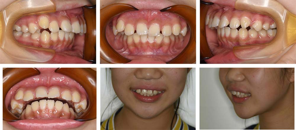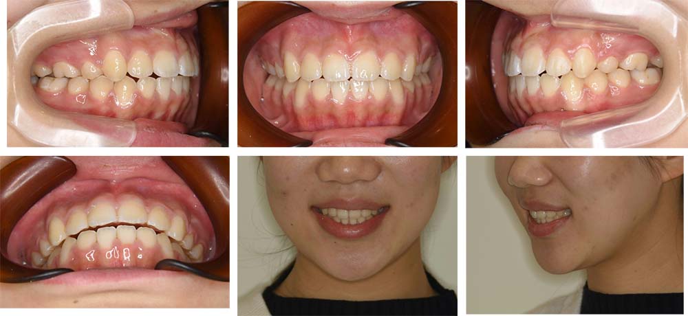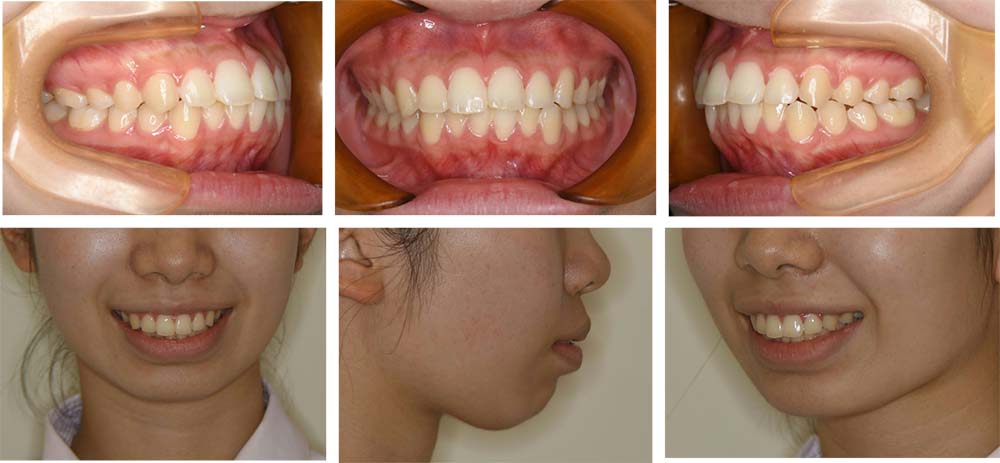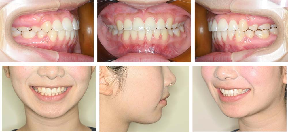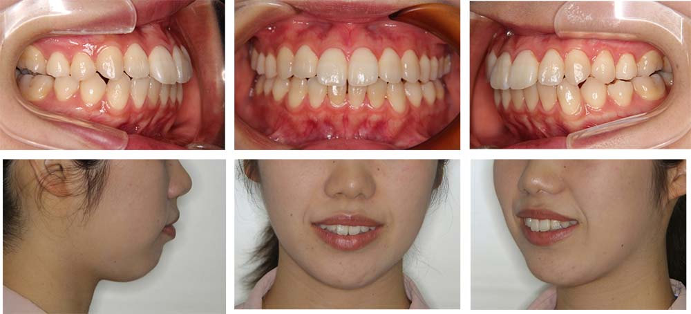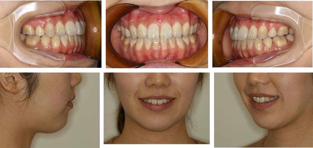 口元の突出を主訴としてご来院いただいた。患者さんは小学生から中学生にかけて非抜歯でマルチブラケット装置(?)で治療を行ったとのことであった。このため、歯列の乱れは大きくなく下顎前歯部の軽度の叢生があるのみであった。しかし、上下の口唇はEラインからそれぞれ約4㎜/8㎜突出していて、患者さんはこれを非常に気にされていた。セファログラム他分析を行い上下顎前歯の前方傾斜が顕著なことが分かった。これらの結果から上下顎小臼歯を抜歯していただき、上顎舌側、下顎唇側マルチブラケット装置を使用し矯正用アンカースクリューを口蓋に併用して動的治療を行った。上下の前歯は十分後退して上下の口唇はほぼEライン上にすることができた。小中学生では患者さん本人もそうであるが保護者様が抜歯を行うことを嫌うことが多い、しかし、特に女子は成人後の状態を考慮して治療を行う必要があると考える。早期治療が有効な場合もあるがそういったケースでは非抜歯にこだわることなく治療方針、治療計画を立案することが大切である。動的治療期間2年3カ月間。