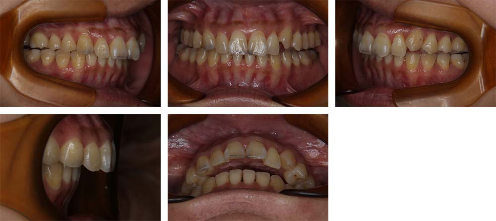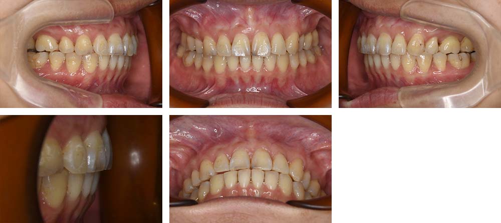 数年前から一般歯科医にてマウスピース型矯正装置(インビザライン)で治療を行っているが上顎前突が改善しないことが主訴で来院した。大臼歯関係はⅡ級で上顎前歯は約7㎜突出し、前歯部は咬合接触が無く開咬となっていた。また小臼歯、大臼歯部は上下の歯列幅径の調和が無く上顎歯列が極端に広い状態で大臼歯が辛うじて咬合接触していた。非抜歯での治療計画がなされているようであるが、明らかに咬合状態の改善は行えない治療計画であると考えられた。 セファログラム他の分析を行い、骨格性上顎前突と診断し上下顎マルチブラケット装置に矯正用アンカープレートを併用して上顎小臼歯を抜歯していただき動的治療を行った。患者は歯科衛生士の有資格者であったことから普段から筋機能療法を行うように指示した。動的治療2年8カ月を要したが、正常な咬合状態とすることができた。