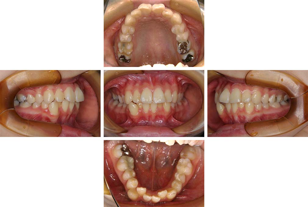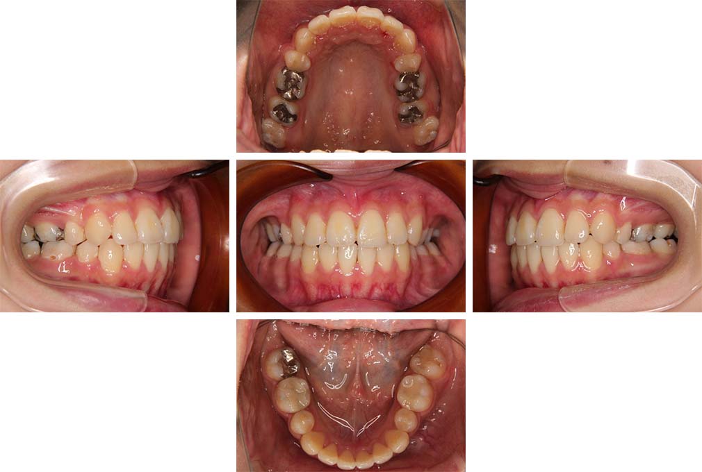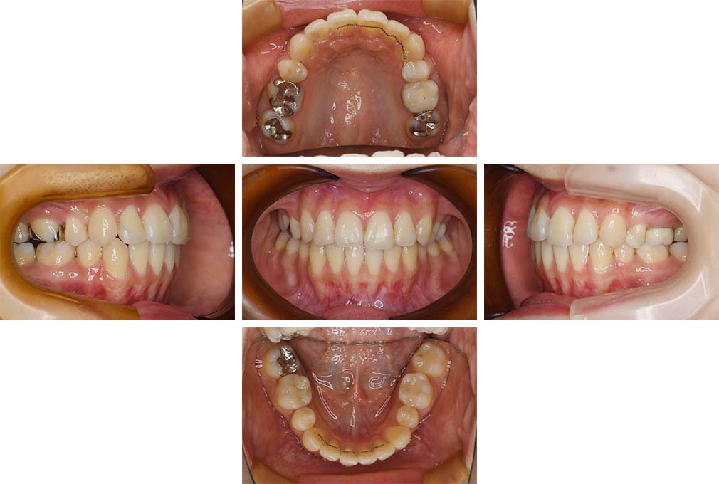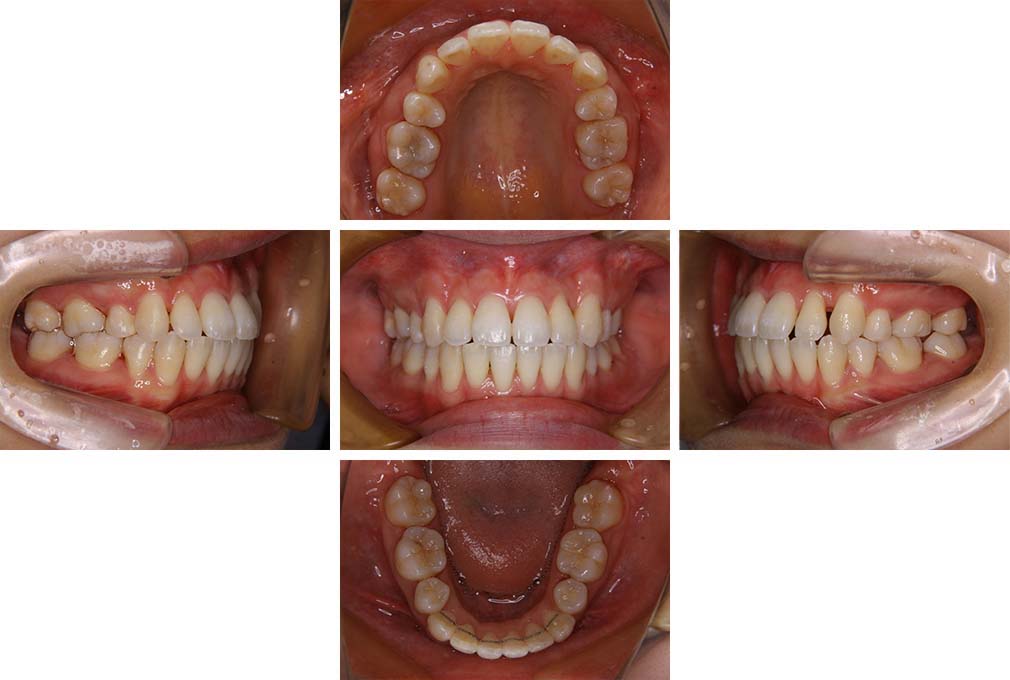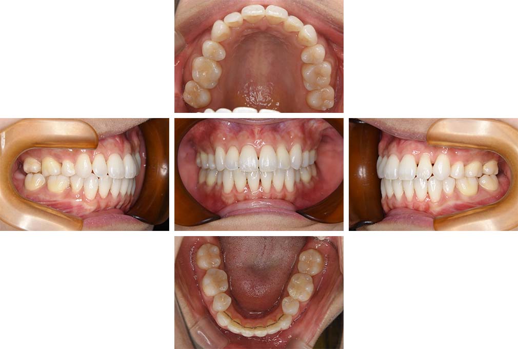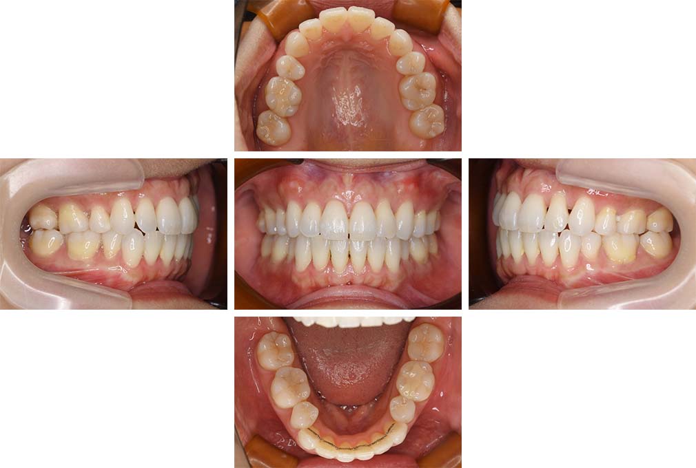 上下顎前歯部がデコボコに生えている叢生(そうせい)を主訴として来院された。上下顎骨に前後的なずれはほぼ無く上下顎第一小臼歯を抜歯していただき、上下顎マルチブラケット装置を使用して動的治療を行った。矯正用ゴム等の使用状況も良く動的治療期間2年0カ月で装置を撤去し保定へ移行した。その後、ほぼ1年に1回の定期健診には来院されている。治療終了10年を過ぎたころから治療前に唇側転位となっていた下顎右側犬歯部が外側へ少し移動し、切端咬合となっていた。上下顎智歯抜歯も行い、治療後21年4カ月となる35歳1か月時にも状態は変わらず、歯列は安定している。動的治療期間2年0カ月間。