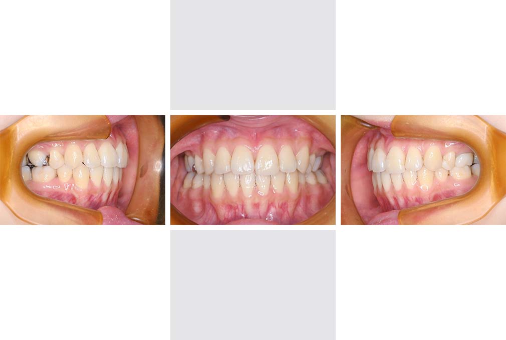 上下顎前歯部の著しい叢生を主訴にご来院いただいた。上下の前歯は叢生となり、また開咬となっていた。左側は大臼歯関係がⅡ級で上顎の方が前方へ咬合していた。セファログラム他分析を行うい、ハイアングル、前歯部開咬と著しい叢生を伴うアングルⅡ不正咬合と診断し上下顎唇側マルチブラケット装置にクアドヘリックス拡大装置と矯正用アンカープレートを併用して動的治療を行った。また、筋機能療法も併用した。動的治療期間2年5カ月間で保定に移行した。その後、1年に1回程度の観察を経て、動的治療終了から11年後にご令嬢の矯正治療のご相談に来院いただいた際に口腔内を拝見したが、乱れもなくボンディングリテーナー周囲の清掃も良好な状態であった。ボンディングリテーナーは何度か撤去することを提案していたが、後戻りの不安から維持されていた。