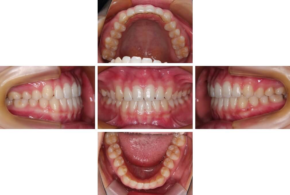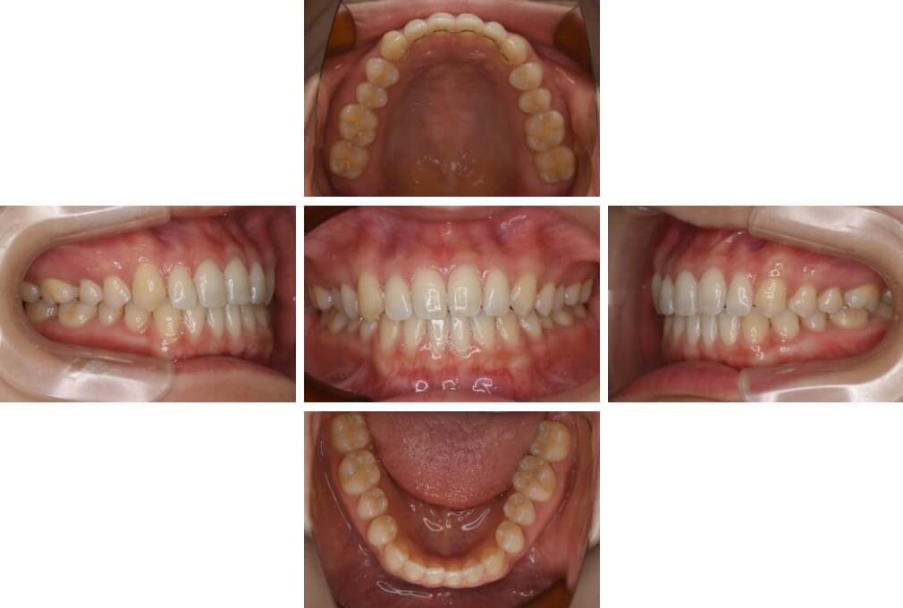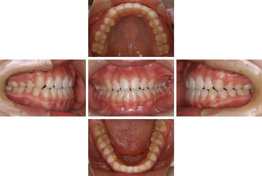上顎前歯部の叢生を主訴としてご来院いただいた。上顎は側切歯が口蓋側転位となり捻転していた。また、左右共に犬歯部は咬合接触が無く開咬状態であった。口元の形態も考慮して、上顎左右側第一小臼歯、下顎左右側第二小臼歯を抜歯していただき、上下顎マルチブラケット装置を使用動的治療を行った。動的治療期間1年11か月間 捻転が強かった上顎左右側側切歯部はいわゆるブラックトライアングルとなっているが、その後保定装置を使用していただき1年に1回はご来院いただいて経過観察を行っている。